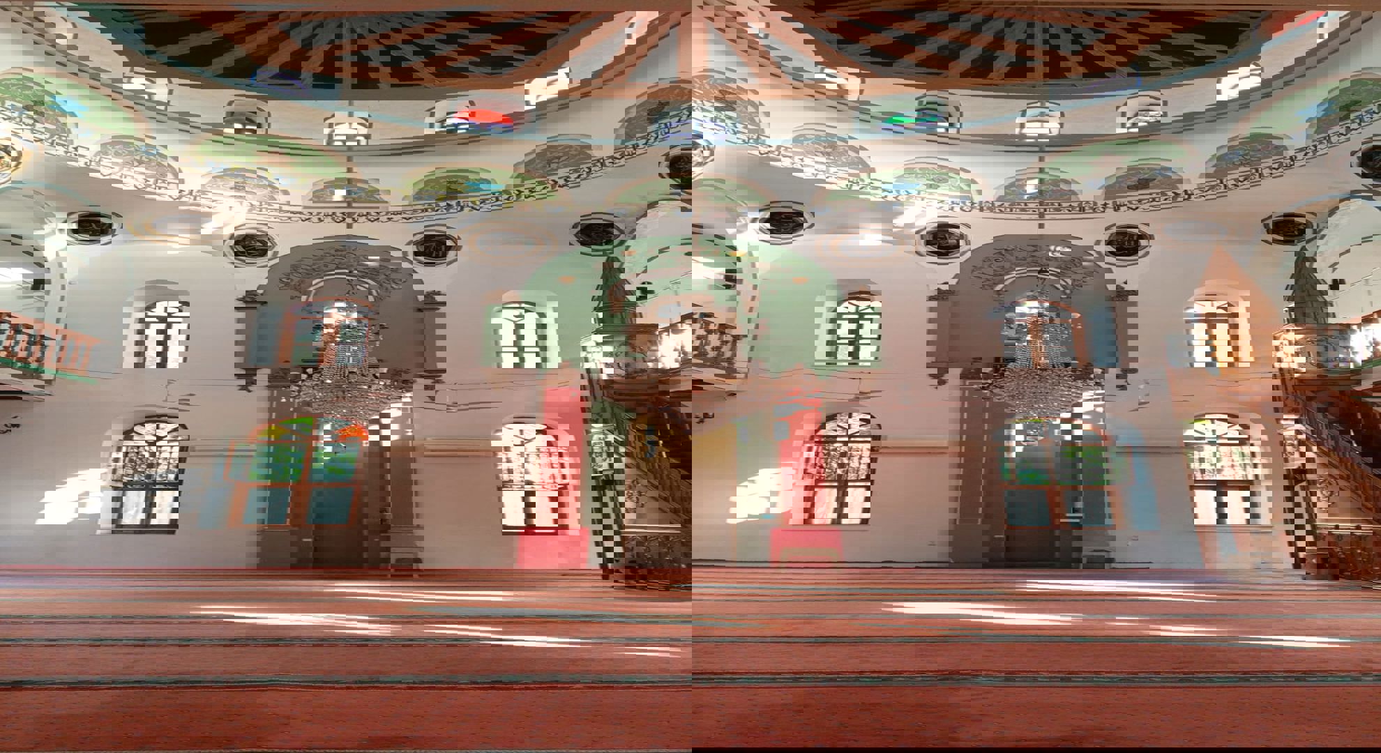 Kesme taş duvarlı yapının merkezini örten, ahşap iskeletli ve bakır kaplı 11 m çapındaki yarım küre kubbe, çokgen kasnak üzerine, pandantif geçişle mihrap duvarına ve sekiz selvi direğe oturur. Pandantiflerin üzerinde Hattat Bekir Acar’ın 1934’te yazdığı hat eserleri yer alır: sağda Allah (c.c.), solda Hz. Muhammed (s.a.s.) ve aşere-i mübeşşere isimleri bulunur. Bezemeler Eyüp Timurmülk tarafından farklı dönemlerde yapılmıştır.