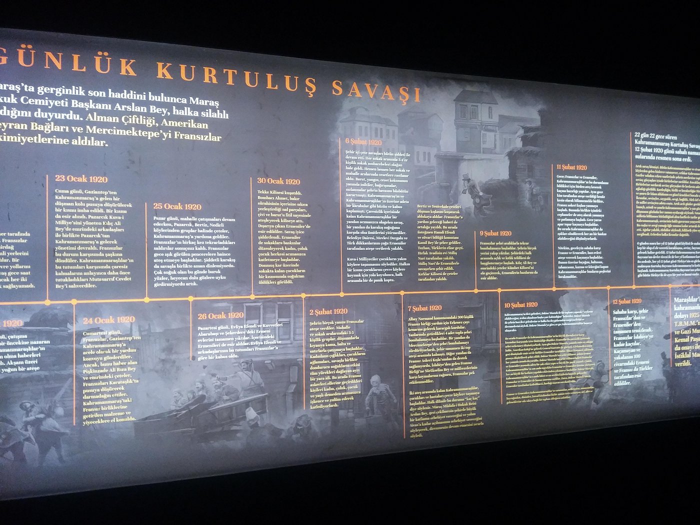 Kahramanmaraş'ın Onikişubat ilçesindeki Kültür Park içerisinde yer alan Kurtuluş Destanı Panorama Müzesi, şehrin Millî Mücadele'deki kahramanlıklarını teknoloji ve sanatı birleştirerek anlatan etkileyici bir mekândır. Ziyaretçilerini, Maraş'ın işgal günlerinden kurtuluşa uzanan destansı yolculuğuna çıkaran müzede, 3D animasyon filmi, panoramik resimler, ses ve ışık efektleri ile zenginleştirilmiş 13 farklı sahne bulunmaktadır. Gezi, Sütçü İmam olayından Abdal Halil Ağa'ya, şehrin kurtuluşundan 12 Şubat kutlamalarına kadar tarihin önemli anlarını adeta yeniden yaşatarak ziyaretçilere unutulmaz bir deneyim sunar. Müzede ayrıca, o döneme ait silahlar ve eşyalar gibi etnografik eserler de sergilenmektedir.