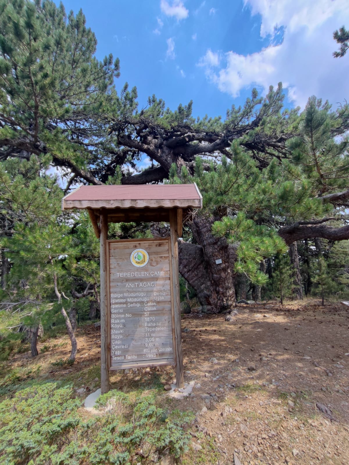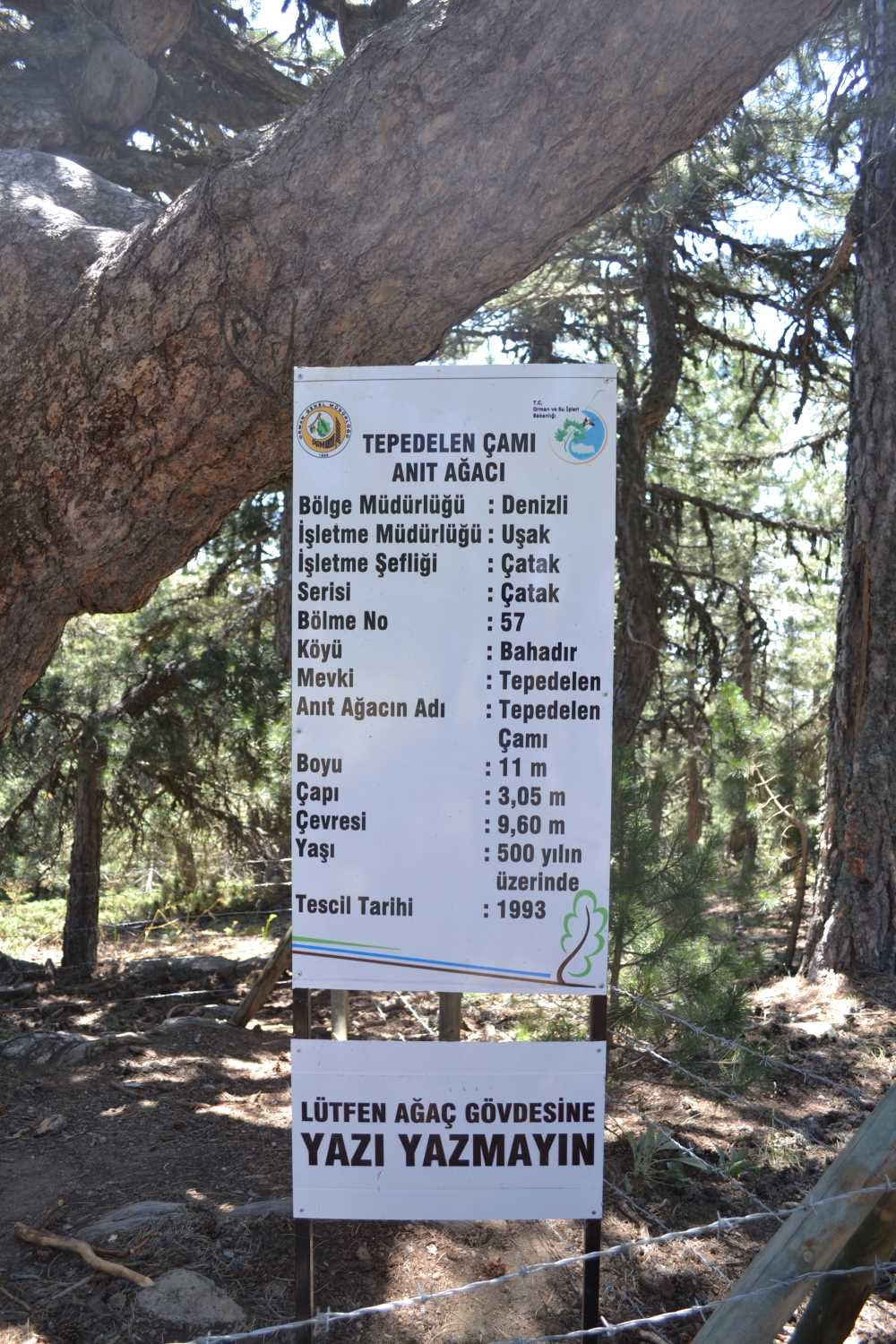 Uşak İli Banaz İlçesi Bahadır Köyü Tepedelen Mevkii'nde bulunan Tepedelen Çamı'nın; boyu 11, çapı 3.05, çevresi 9.60 ve rakımı 1870 metre; yaşı 500-1000 yıl arası, kapladığı alan 380 metrekaredir. Yedi kişinin kollarıyla ancak gövdesini sarabildiği “Çam Ağacı” Tarım ve Orman Bakanlığı tarafından “Anıt Ağaç” tescil edilmiş ve koruma altına alınmıştır. Gerçekten görülmeye değer nadide tabiat değerlerinden birisidir.